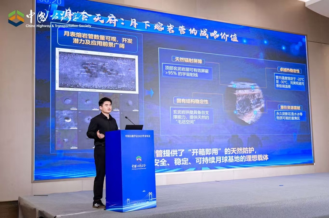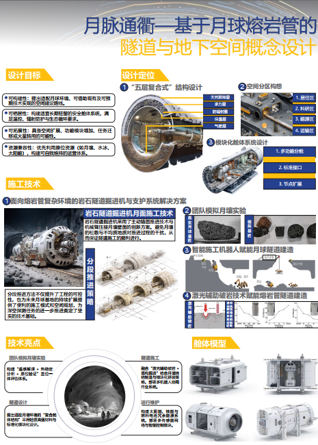 我院师生的参赛作品《月脉通衢——基于月球熔岩管的隧道与地下空间概念设计》精准把握“跨界融合”的大赛精神,基于团队在太空采矿、行星土力学及月表极端环境模拟等方面的研究积累,将传统隧道工程与深空探测、行星地质、原位资源利用及智能建造等多学科深度交叉。方案创新性地提出以月球熔岩管为天然载体,系统构建了包含 “五维守护”复合结构、“人机协同”智能建造和“激光辅助破岩” 等关键技术的完整工程体系,为深空探索月下空间提供了创新性解决方案。