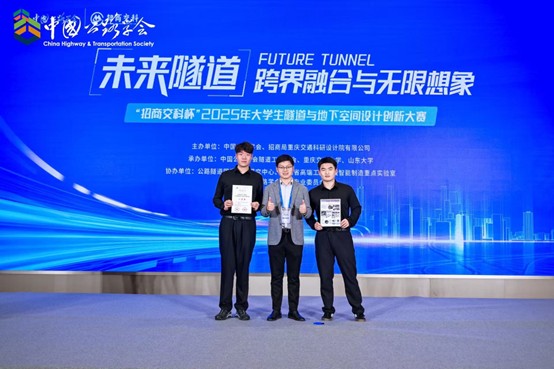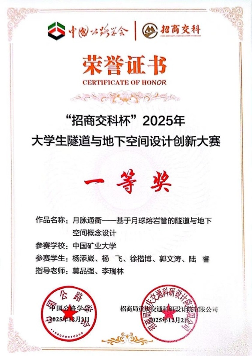 由中国公路学会、招商局重庆交通科研设计院有限公司主办,中国公路学会隧道工程分会、重庆交通大学、山东大学承办的“招商交科杯”2025全国大学生隧道与地下空间设计创新大赛全国总决赛于2025年12月2日在厦门举行。经过激烈角逐,由我院莫品强、李瑞林老师指导,杨添崴、杨飞、徐楷博、郭文涛和陆睿组成的参赛团队,凭借作品《月脉通衢——基于月球熔岩管的隧道与地下空间概念设计》,荣获全国一等奖。
