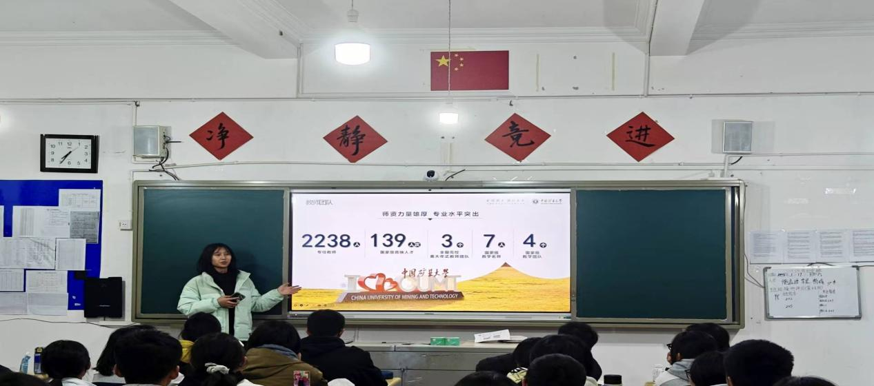 团队以PPT、校园风光视频为载体,从学科优势、科研平台、校园文化,招生情况等方面全方位介绍矿大,重点解读了学校国家级特色专业的发展前景,分享了大学生活中的学术探索与社团实践。此次活动取得了显著的宣传成效。通过面对面的深入交流,有效破除了部分学子对矿业类高校的认知误区,让更多人了解到中国矿业大学在能源科技领域的深厚积淀、行业优势与社会责任,不少学弟学妹对矿大的特色专业产生了浓厚兴趣。