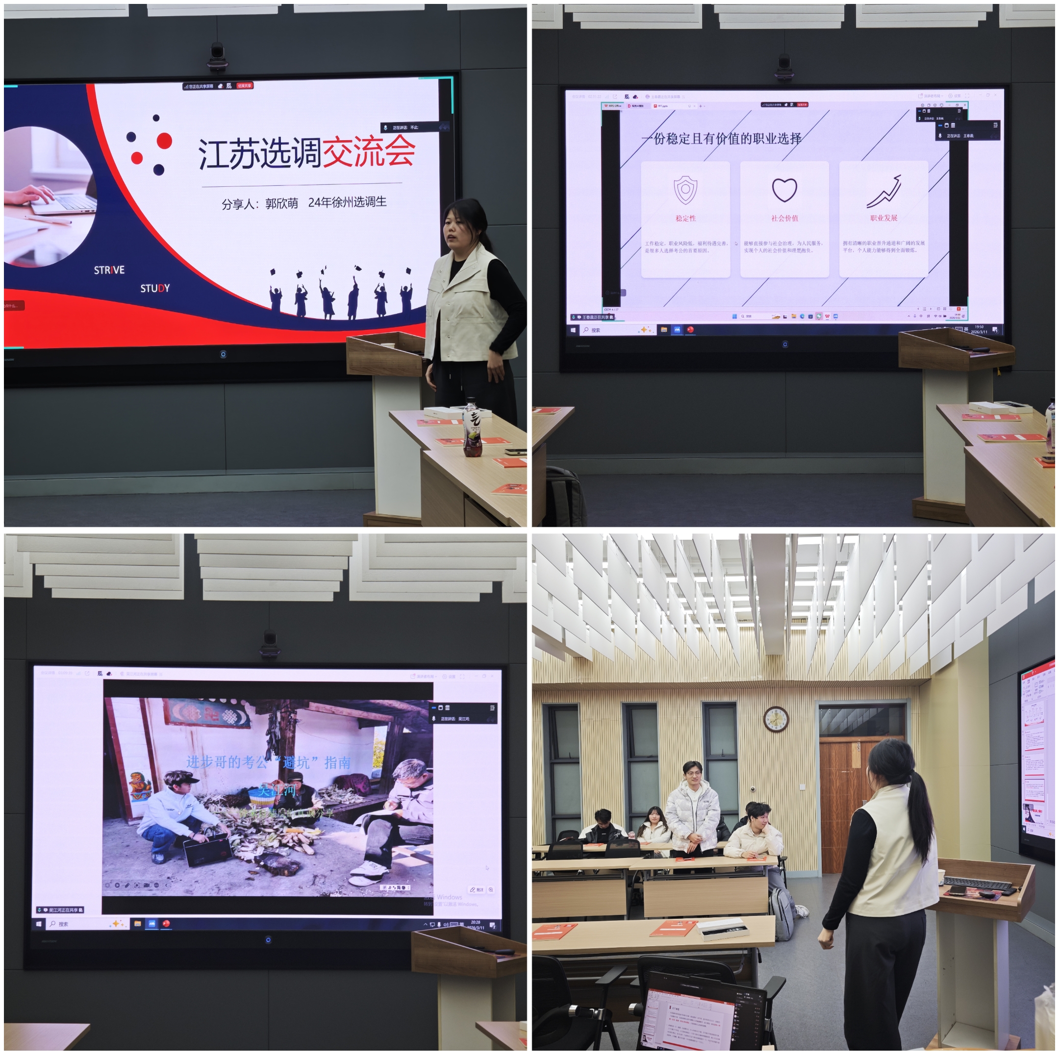 3月11日晚19:00,在学院楼B201举办了线下考公经验分享会,活动邀请了郭欣萌、王春晨、吴江河三位优秀校友及专业考公机构人员,向同学们分享备考经验与应试技巧,帮助同学们科学备考公务员考试,活动由辅导员张琳、兼职辅导员张泽杨主持。