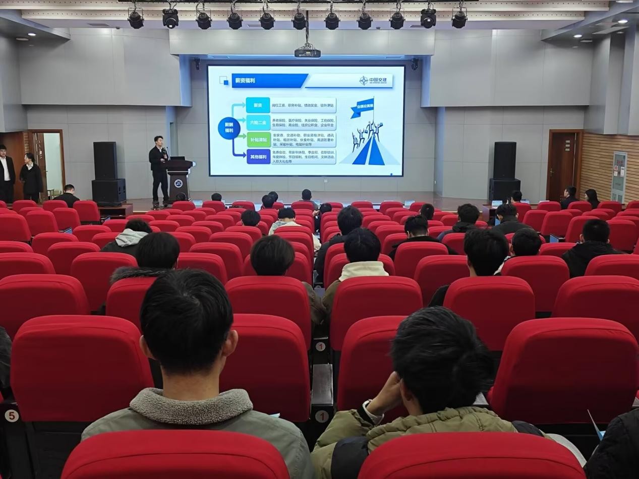3月23日,中交集团携旗下一航局、中交路建和广航局等16家子企业走进学院,在A108报告厅举办2026年春季校园专场招聘活动,吸引众多应届毕业生前来应聘洽谈,提供涵盖土木工程、工程管理和工程力学等专业的数十个岗位。学院党委副书记纪承和毕业班辅导员游洋、张琳、朱宁、仰玉江与用人单位负责人交流,了解行业用人需求新趋势,精准对接优质企业资源,全力促进2026届毕业生更高质量、更充分就业。